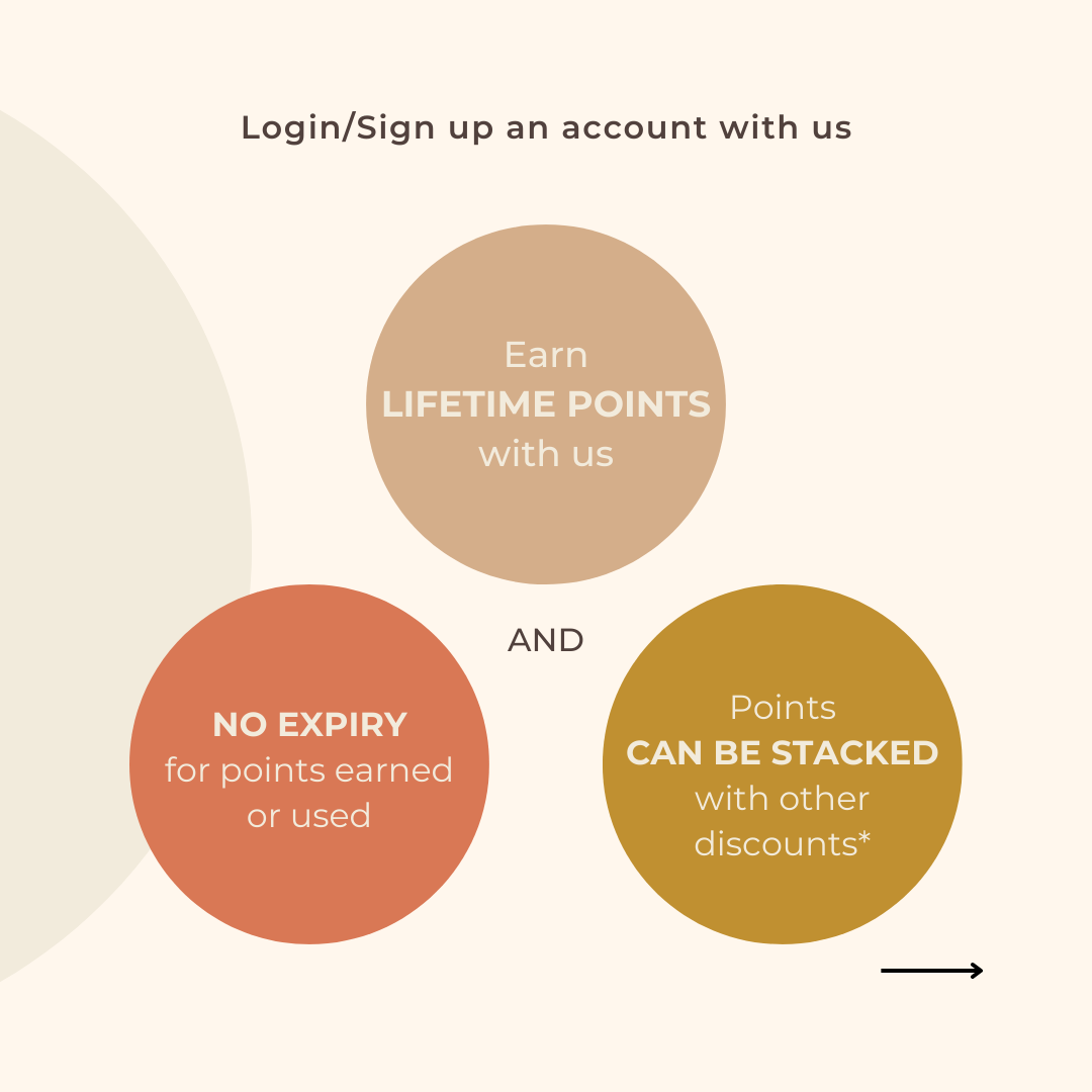 For every 50 points earned, which is equivalent to S$1, you can use them to offset your transaction amount when making a purchase on our website.