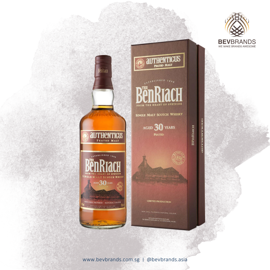 BenRiach 30 Years Old Authenticus Peated Speyside Single Malt Scotch Whisky Singapore is a 700mL whisky with 46.8% Alcohol By Volume (ABV) from Scotland sold by Bevbrands Singapore.